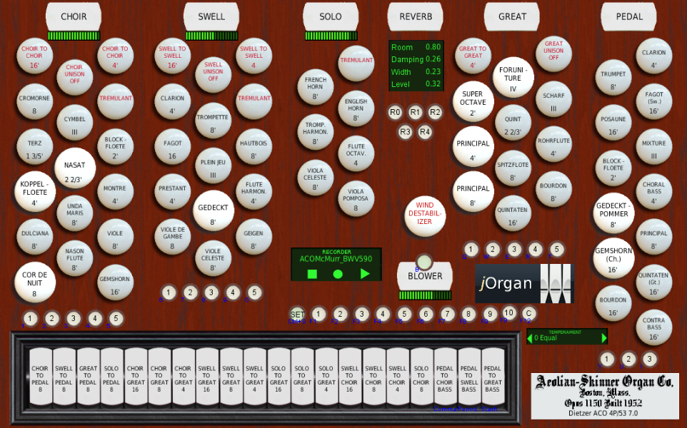 based on the Aeolian-Skinner organ in the Cathedral of St. John the Divine in New York City and features several alterable voices.