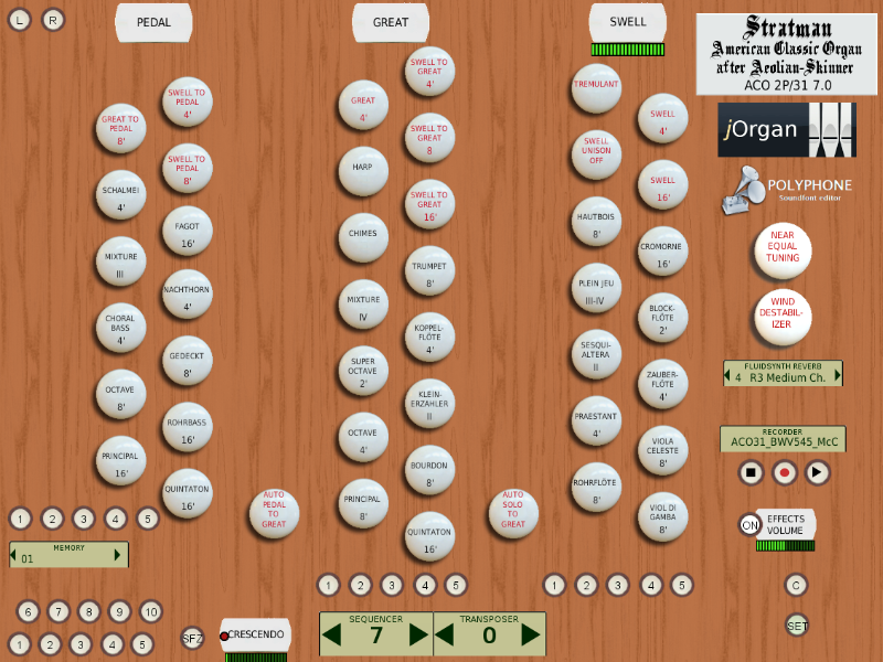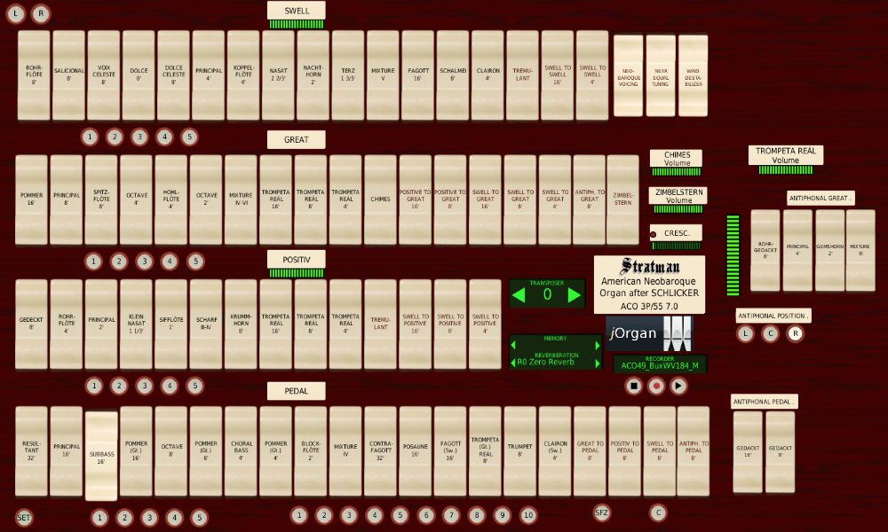 Except for percussion stops, all voices of this organ were created with additive synthesis, tonally matching spectral analysis
