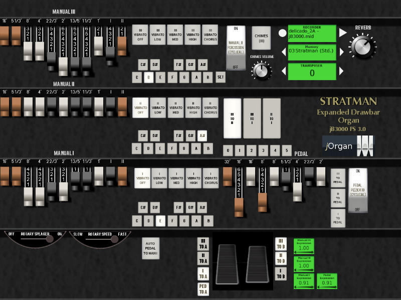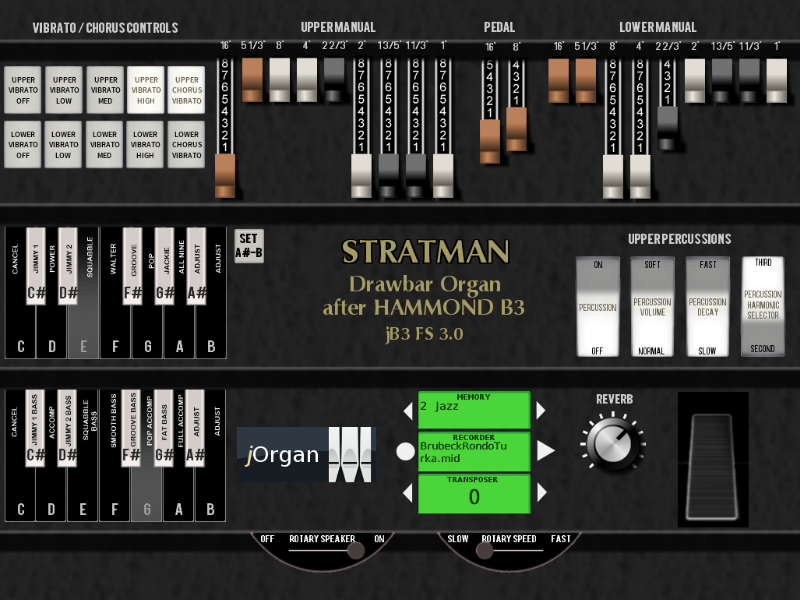 All switches of the Hammond B3 are emulated, along with a built-in Leslie simulation using Fluidsynth’s chorus settings.