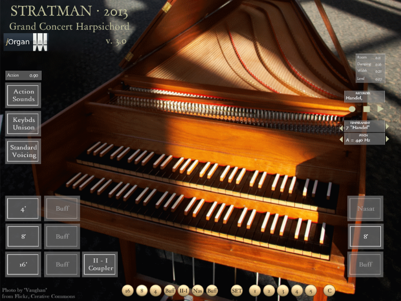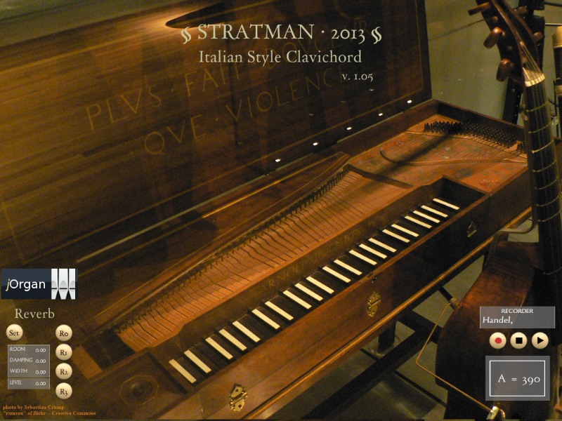 The virtual harpsichord uses samples from ODF GrandOrgue and “Loofas Clavecin” through a Creative Commons