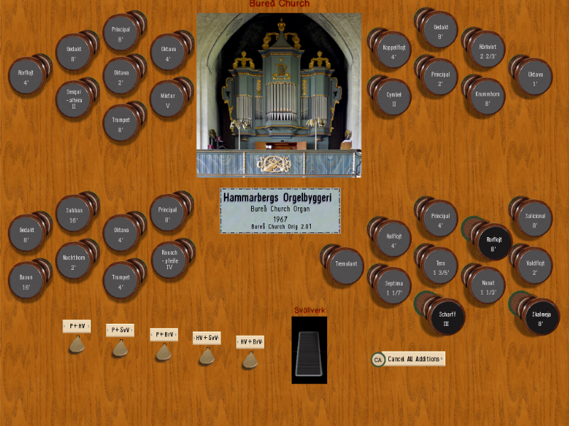 of the Burea Church Organ. One console screen is absolutely true to the original. A second provides a full complement